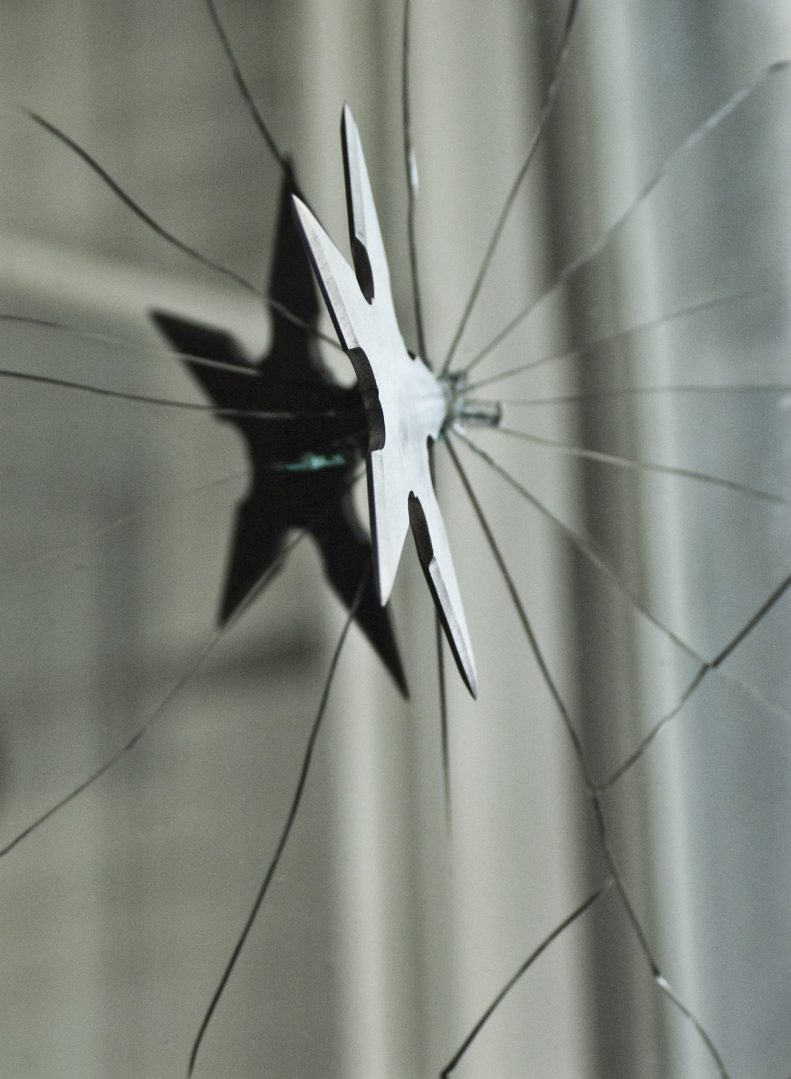 Iv Toshain entlarvt in ihren Arbeiten mediale Ikonen als glamourös konstruierte Hyperrealitäten, deren Hauptzweck darin besteht, den gesellschaftlichen Status quo zu sichern. Geprägt von ihrer Kindheit während des Ersten Golfkriegs im Iran, konnotiert die Künstlerin den Begriff des Shooting Star neu. In ihren performativen Stunt Paintings zielt Toshain in einer revolutionären wie poetischen Geste mit Wurfsternen auf Seiden-Leinwände, deren blutende, aufgerissene Bildoberflächen Textnachrichten der Künstlerin sichtbar werden lassen. Als einstige Sinnbilder von Hoffnung, Schutz und Freiheit (In der politischen Symbolik verkörpert der Stern Freiheit, Brüderlichkeit, Gleichheit und damit das Prinzip Demokratie.) verzeichnen Sterne nun Zerstörung und Schmerz.
